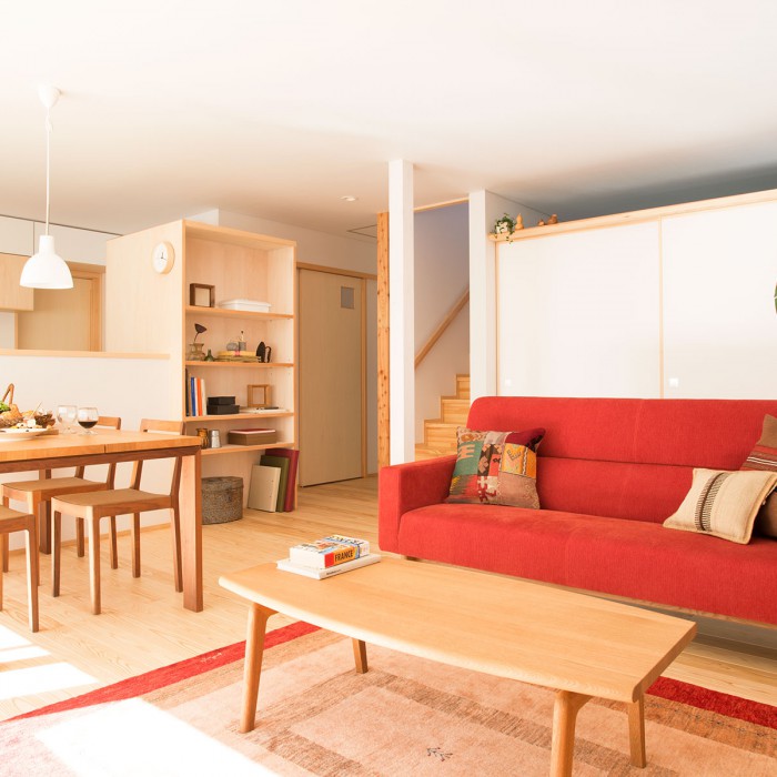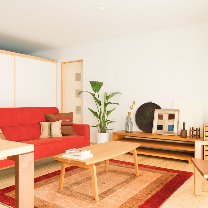 三角の切り妻屋根は、家のスタンダードでベーシックなカタチ。木材をふんだんに使った内装は、シンプルさと快適な暮らしを両立する、キモチのいい空間を形作っています。晴れた空に見上げる三角屋根に、大きな窓からリビングに差し込む光。シンプルなフォルムだからこそ、永く住み続けながら暮らしを楽しめる、そんな理想の家ができました。